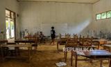REPUBLIKA.CO.ID, PANDEGLANG -- Dua anak bermain di dalam kelas yang rusak saat libur sekolah di SD Negeri 3 Kutakarang (Kelas Jauh), Pandeglang, Banten, Rabu (25/10/2023).