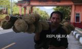Pedagang memikul buah durian untuk dijual ke Ternate di Taman Rum Tidore, Kota Tidore Kepulauan, Maluku Utara, Rabu (25/10/2023). Buah durian unggulan khas Tidore Kepulauan yang dipetik pada puncak musim panen di daerah itu kemudian dibawa para pedagang durian menggunakan kapal kayu untuk dijual ke Ternate dengan harga Rp50 hingga Rp75 ribu per buah tergantung jenis dan ukuran buah durian. (FOTO : Antara/Andri Saputra)
