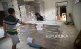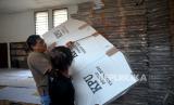 Pekerja memindahkan logistik Pemilihan Umum (Pemilu) 2024 berupa bilik suara ke dalam gudang KPU Kabupaten Sleman, Yogyakarta, Kamis (26/10/2023). KPU Kabupaten Sleman menerima 13.828 bilik untuk Pemilu 2024 mendatang. Bilik suara ini dikirim ke Sleman menggunakan tiga truk tronton. Nantinya jumlah bilik ini akan disebar ke 3.446 tempat pemungutan suara (TPS) saat Pemilu serentak 2024 pada 14 Februari 2024. (FOTO : Republika/Wihdan Hidayat)
