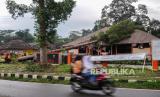 Pengendara roda dua melintas di depan Kantor Kecamatan Karang Tanjung yang tertimpa pohon di Pandeglang, Banten, Kamis (26/10/2023). Angin kencang disertai hujan deras yang terjadi di kawasan tersebut mengakibatkan belasan rumah serta gedung perkantoran mengalami kerusakan dan menyebabkan satu orang warga meninggal dunia akibat tertimpa pohon.   (FOTO : Antara/Muhammad Bagus Khoirunas )