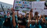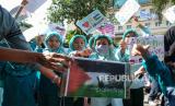 Siswa SD Al Firdaus Solo mengusung poster dukungan untuk warga Palestina di halaman sekolah setempat, Solo, Jawa Tengah, Jumat (27/10/2023). Aksi solidaritas tersebut sebagai edukasi sosial bagi siswa sekaligus mengajak warga Indonesia turut membantu masyarakat Palestina dan mengecam serangan Israel yang menyebabkan ribuan korban jiwa. (FOTO : ANTARAFOTO/Maulana Surya)
