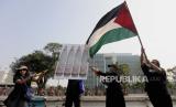 Sejumlah pegiat HAM dari Amnesty International Indonesia membentangkan poster dan mengibarkan bendera Palestina saat melakukan aksi di depan Kedutaan Besar Amerika Serikat untuk Indonesia, Jakarta, Jumat (27/10/2023). Dalam aksinya mereka meminta Israel menghentikan serangan besar-besaran ke Gaza sekaligus mengakhiri penindasan sistem apartheid kepada warga Palestina. (FOTO : Republika/Putra M. Akbar)