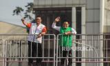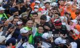 Bacapres Anies Baswedan (kiri) dan Bacawapres Muhaimin Iskandar menyapa pendukungnya pada acara senam dan jalan bareng AMIN di Grand Depok City, Kota Depok, Jawa Barat, Sabtu (28/10/2023). Kegiatan yang diikuti oleh ribuan simpatisan dan kader partai dari Koalisi Perubahan tersebut sebagai bentuk dukungan terhadap pasangan bakal calon Presiden dan bakal calon Wakil Presiden Anies Baswedan-Muhaimin Iskandar pada Pilpres 2024. (FOTO : Republika/Putra M. Akbar)