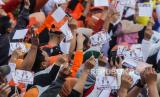 Sejumlah simpatisan menunjukan syal bertuliskan AMIN pada acara senam dan jalan bareng AMIN di Grand Depok City, Kota Depok, Jawa Barat, Sabtu (28/10/2023). Kegiatan yang diikuti oleh ribuan simpatisan dan kader partai dari Koalisi Perubahan tersebut sebagai bentuk dukungan terhadap pasangan bakal calon Presiden dan bakal calon Wakil Presiden Anies Baswedan-Muhaimin Iskandar pada Pilpres 2024. (FOTO : Republika/Putra M. Akbar)
