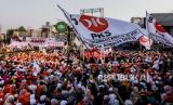 Sejumlah simpatisan mengibarkan bendera pada acara senam dan jalan bareng AMIN di Grand Depok City, Kota Depok, Jawa Barat, Sabtu (28/10/2023). Kegiatan yang diikuti oleh ribuan simpatisan dan kader partai dari Koalisi Perubahan tersebut sebagai bentuk dukungan terhadap pasangan bakal calon Presiden dan bakal calon Wakil Presiden Anies Baswedan-Muhaimin Iskandar pada Pilpres 2024. (FOTO : Republika/Putra M. Akbar)