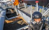 Awak kapal pengawas Kelautan dan Perikanan berjaga di Kapal MV VOX MAXIMA berbendera Belanda yang mengangkut pasir laut di Perairan Teluk Jakarta, Sabtu (28/10/2023). Kementerian Kelautan dan Perikanan (KKP) menghentikan dan memeriksa satu kapal hisap pasir laut yang diduga melakukan aktivitas pengerukan pasir tanpa dilengkapi dengan Persetujuan Kegiatan Pemanfaatan Ruang Laut (PKKPRL). (FOTO : ANTARA FOTO/Bayu Pratama S)