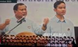 Bakal Calon Presiden (Bacapres) Koalisi Indonesia Maju (KIM) Prabowo Subianto menyampaikan pidato politiknya saat menghadiri acara deklarasi dukungan relawan Penerus Negeri di Jakarta, Sabtu (28/10/2023). Relawan Pemuda Penerus Negeri mendeklarasikan dukungannya untuk pasangan capres-cawapres Prabowo Subianto-Gibran Rakabuming Raka dalam kontestasi Pilpres Pemilu 2024. Acara tersebut juga dihadiri oleh Ketua Tim Pemenangan Prabowo-Gibran yakni Rosan Roeslani dan Menteri Investasi Bahlil Lahadalia serta relawan pendukung dari kalangan pelajar, anak muda dan orang tua. (FOTO : Republika/Thoudy Badai)