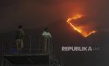 Warga melihat kebakaran Gunung Merbabu di Jlarem, Gladagsari, Boyolali, Jawa Tengah, Sabtu (28/10/2023). Balai Taman Nasional Gunung Merbabu menutup semua jalur pendakian Gunung Merbabu akibat terjadinya kebakaran hutan dan lahan di wilayah tersebut. (FOTO : ANTARA FOTO/Aloysius Jarot Nugroho)