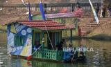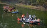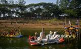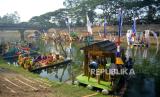 REPUBLIKA.CO.ID,JAKARTA -- Peserta dengan menggunakan rakit hias bersiap menyusuri aliran Banjir Kanal Timur (BKT) Duren Sawit saat mengikuti Pawai Lumbung Sungai, Jakarta, Ahad (29/10/2023).