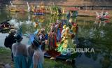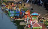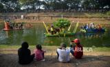 Peserta dengan menggunakan rakit hias menyusuri aliran Banjir Kanal Timur (BKT) Duren Sawit saat mengikuti Pawai Lumbung Sungai, Jakarta, Ahad (29/10/2023). Pawai Lumbung Sungai yang merupakan bagian rangkaian dari Pekan Kebudayaan Nasional (PKN) 2023 ini dimeriahkan oleh kolaborasi antara pekerja seni, komunitas peduli sungai, delegasi Provinsi dan warga sekitar lokasi. (FOTO : Republika/Prayogi)