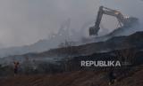 Sejumlah petugas menggunakan eskavator melakukan proses pendinginan TPST (Tempat Pembuangan Sampah Terpadu) Bantargebang, Bekasi, Jawa Barat, Ahad (29/10/2023). Menurut keterangan Dinas Lingkungan Hidup (DLH) DKI Jakarta sebanyak 19 mobil pemadam dikerahkan untuk memadamkan api pada kebakaran yang terjadi pada pukul 13.30 WIB dan penyebab kebakaran di zona 2 TPST tersebut masih dalam penyelidikan. (FOTO : Antara/Fakhri Hermansyah)