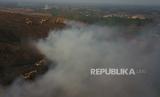 Foto udara alat berat eskvator saat proses pendinginan kebakaran TPST (Tempat Pembuangan Sampah Terpadu) Bantargebang, Bekasi, Jawa Barat, Minggu (29/10/2023). Menurut keterangan Dinas Lingkungan Hidup (DLH) DKI Jakarta sebanyak 19 mobil pemadam dikerahkan untuk memadamkan api pada kebakaran yang terjadi pada pukul 13.30 WIB dan penyebab kebakaran di zona 2 TPST tersebut masih dalam penyelidikan. (FOTO : Antara/Fakhri Hermansyah)