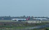 Dua pesawat lepas landas dari Bandara Internasional Jawa Barat (BIJB) di Kertajati, Majalengka, Jawa Barat, Ahad (29/10/2023). Kementerian Perhubungan memindahkan semua penerbangan dari Bandara Husein Sastranegara Bandung ke Bandara Internasional Jawa Barat per tanggal 29 Oktober 2023. (FOTO : Antara/Dedhez Anggara)