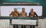 Direktur Treasury & International Banking BSI Moh. Adib (tengah) bersama Direktur Utama Bank KB Bukopin Syariah Koko Tjatur Rahmadi (kiri), dan Pemimpin Divisi Syariah Bankaltimtara Taufik Curakhman (kanan) saat penandatanganan kerja sama transaksi Repo Syariah (Transaksi Repurchase Agreement Surat Berharga Syariah Berdasarkan Prinsip Syariah) di gelaran ISEF ke 10 di JCC Senayan, Jakarta, pekan lalu. Kerja sama ini adalah sebagai bentuk nyata dukungan konstruktif dari BSI beserta Asbisindo yang mewadahi berkumpulnya bank-bank syariah terhadap inisiatif Bank Indonesia (BI) untuk memperkuat sektor keuangan syariah di Indonesia. (FOTO : Dok Republika)