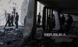 Orang-orang berdiri di dekat reruntuhan Gereja Ortodoks Yunani Saint Porphyrius setelah serangan udara semalam di Gaza, (20/10/ 2023). (FOTO : EPA-EFE/MOHAMMED SABER)