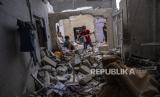 Warga Palestina memeriksa puing-puing sebuah rumah setelah terkena serangan udara Israel di Khan Younis, Jalur Gaza selatan, Ahad, (29/10/2023). (FOTO : AP Photo/Fatima Shbair)