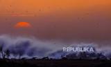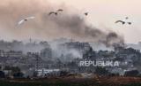 Burung melintas saat asap mengepul dari bagian utara Jalur Gaza akibat serangan Israel, Ahad (29/10/2023. (FOTO : EPA-EFE/HANNIBAL HANSCHKE)