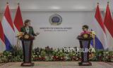 Menteri Luar Negeri RI Retno Marsudi (kanan) dan Menteri Luar Negeri Belanda Hanke Bruins Slot (kiri) menyampaikan keterangan kepada wartawan usai melakukan pertemuan bilateral di Gedung Kemenlu, Pejambon, Jakarta, Selasa (31/10/2023). Pertemuan tersebut membahas kerja sama budaya, investasi, dan perdagangan sekaligus membahas repatriasi benda-benda cagar budaya milik Indonesia dari Belanda serta penanganan pengiriman bantuan kemanusiaan di Gaza, Palestina. (FOTO : EPA-EFE/MAST IRHAM)