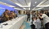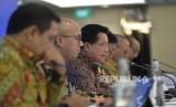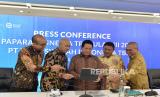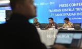 Direktur Utama BSI Hery Gunardi (kedua kanan) memberikan paparan kinerja BSI kuartal III/2023 di Jakarta, Selasa (31/10/2023). PT Bank Syariah Indonesia Tbk (BSI) berhasil menjaga kinerja yang solid hingga kuartal III/2023 dan mencetak laba yakni Rp 4,20 Triliun atau tumbuh 31,04 persen. (FOTO : Dok Republika)