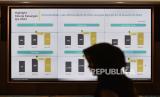 Karyawan melintas di depan layar yang menampilkan informasi kinerja BSI saat paparan kinerja BSI kuartal III/2023 di Jakarta, Selasa (31/10/2023). PT Bank Syariah Indonesia Tbk (BSI) berhasil menjaga kinerja yang solid hingga kuartal III/2023 dan mencetak laba yakni Rp 4,20 Triliun atau tumbuh 31,04 persen. (FOTO : Dok Republika)
