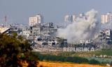Pemandangan bangunan yang hancur saat asap mengepul dari bagian utara Jalur Gaza akibat penembakan Zionis Israel, terlihat dari Sderot, Israel selatan, Selasa (31/10/2023). (FOTO : EPA-EFE/HANNIBAL HANSCHKE)