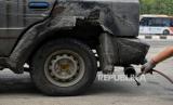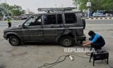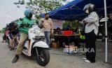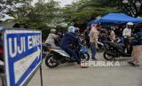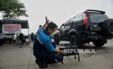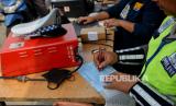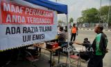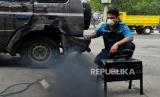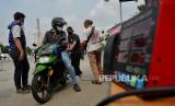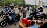 Petugas gabungan dari Ditlantas Polda Metro Jaya, Dinas Lingkungan Hidup DKI Jakarta dan Dinas Perhubungan DKI Jakarta menindak pengendara pada saat razia tilang uji emisi di kawasan Cakung, Jakarta, Rabu (1/11/2023). Pemprov DKI Jakarta resmi memberlakukan kembali tilang uji emisi mulai 1 November 2023 sebagai upaya memperbaiki kualitas udara di Jakarta. Bagi pengendara yang tidak lolos uji emisi akan dikenai denda tilang sebesar Rp250 ribu untuk motor dan Rp500 untuk mobil. (FOTO : Republika/Thoudy Badai)