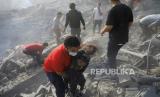 Seorang pria Palestina menggendong seorang anak yang meninggal saat yang lain mencari korban di antara puing-puing bangunan yang hancur pasca serangan udara Israel di kamp pengungsi Jabaliya di pinggiran Kota Gaza, Selasa, (31/10/2023). (FOTO : AP Photo/Abdul Qader Sabbah)