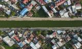 Foto udara kondisi kanal yang dipenuhi tanaman eceng gondok (Eichhornia Crassipes) di Makassar, Sulawesi Selatan, Rabu (1/11/2023). Arus air kanal yang lemah saat kemarau mengakibatkan penumpukan tanaman eceng gondok yang tumbuh subur hingga memenuhi sejumlah kanal di daerah itu, sementara pemerintah setempat mulai melakukan pengerukan guna mencegah pendangkalan dan menormalisasi aliran kanal sebelum memasuki musim hujan. (FOTO : ANTARA FOTO/Arnas Padda)