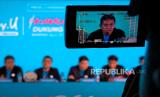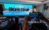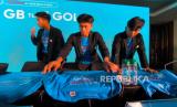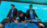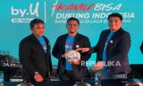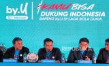 Head of by.U Riko Ringgoanto (tengah) didampingi Pelatih Indonesia U-17 Bima Sakti (kiri) dan GM External Corporate Communication Telkomsel Aldi Hasyim menjelaskan program by U dalam mendukung Timnas U17 menjelang Piala Dunia U-17 di Jakarta, Rabu (1/11). by.U menjadi operator seluler pertama yang akan memberikan reward spesial berupa kuota data sebesar 1GB bagi pelanggannya untuk setiap 1 gol yang diciptakan Indonesia selama laga bola dunia mendatang berlangsung. (FOTO : Republika/Yogi Ardhi)