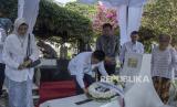 Keluarga Dokter Hasan Sadikin menyiram air di makam keluarga Dokter Hasan Sadikin di Kompleks Makam Bupati Bandung, Astanaanyar, Kota Bandung, Jawa Barat, Kamis (2/11/2023). Upacara tabur bunga tersebut sebagai bentuk penghormatan terhadap jasa dan sumbangsih yang telah diberikan oleh Dokter Hasan Sadikin dalam membangun bidang kesehatan di Indonesia. Selain itu, tabur bunga tersebut digelar dalam rangka memperingati Hari Kesehatan Nasional 2023. (FOTO : ABDAN SYAKURA/REPUBLIKA)