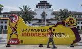 Warga melintas di depan ornamen Piala Dunia U-17 di Taman Gedung Sate, Kota Bandung, Jawa Barat, Kamis (2/11/2023). Ornamen tersebut dipasang dalam rangka memeriahkan perhelatan pertandingan sepak bola Piala Dunia U-17 (FIFA World Cup U-17) yang digelar di Indonesia pada 10 November hingga 2 September 2023. (FOTO : ABDAN SYAKURA/REPUBLIKA)