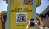 Warga memindai kode batang untuk membeli tiket Piala Dunia U-17 di Taman Gedung Sate, Kota Bandung, Jawa Barat, Kamis (2/11/2023). Ornamen tersebut dipasang dalam rangka memeriahkan perhelatan pertandingan sepak bola Piala Dunia U-17 (FIFA World Cup U-17) yang digelar di Indonesia pada 10 November hingga 2 September 2023.  (FOTO : ABDAN SYAKURA/REPUBLIKA)