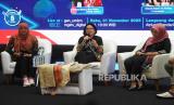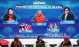 REPUBLIKA.CO.ID, JAKARTA -- Staf Ahli Bidang Keuangan dan Pengembangan UMKM Kementerian BUMN Loto Srinaita Ginting (tengah) menyampaikan pandangannya disaksikan VP CSR & SMEPP Pertamina Fajriyah Usman (kanan) dan salah satu pengusaha UMKM binaan Pertamina Lily Handayani (kiri) dalam diskusi dengan tema Melangkah Dari Lokal ke Global di sela pameran Pertamina SMEXPO 2023 di Gandaria City Mall, Jakarta, Rabu (1/11/2023).