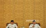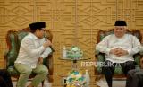 Bakal calon wakil presiden Koalisi Perubahan Muhaimin Iskandar (kiri) saat menerima kunjungan dari mantan Ketua Umum PP Muhammadiyah Din Syamsuddin (kanan) bersama perwakilan ormas islam di Kantor DPP PKB, Jakarta, Jumat (3/11/2023). Pertemuan tersebut dalam rangka silaturahmi sekaligus memberikan dukungan kepada bakal capres dan cawapres Koalisi Perubahan Anies Baswedan dan Muhaimin Iskandar pada Pilpres Pemilu 2024. (FOTO : Republika/Thoudy Badai)