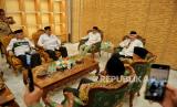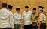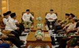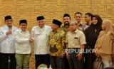 Bakal calon wakil presiden Koalisi Perubahan Muhaimin Iskandar (ketiga kiri) saat menerima kunjungan dari mantan Ketua Umum PP Muhammadiyah Din Syamsuddin (ketiga kanan) bersama perwakilan ormas islam di Kantor DPP PKB, Jakarta, Jumat (3/11/2023). Pertemuan tersebut dalam rangka silaturahmi sekaligus memberikan dukungan kepada bakal capres dan cawapres Koalisi Perubahan Anies Baswedan dan Muhaimin Iskandar pada Pilpres Pemilu 2024. (FOTO : Republika/Thoudy Badai)