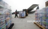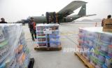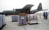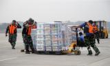 Petugas TNI AU membawa kotak sumbangan yang akan dikirimkan ke warga Palestina di Bandara Halim Perdana Kusuma Jakarta, Sabtu (4/11/2023). (FOTO : EPA-EFE/BAGUS INDAHONO)