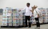 Presiden Indonesia Joko Widodo menempelkan stiker pada kotak sumbangan saat memeriksa kotak sumbangan sebelum TNI AU mengirimkannya di Bandara  Halim Perdana Kusuma Jakarta, Sabtu (4/11/2023). (FOTO : EPA-EFE/BAGUS INDAHONO)