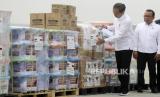 Presiden Joko Widodo (kiri) meninjau bantuan untuk Palestina didampingi Menlu Retno Marsudi (kanan) di Pangkalan Udara TNI AU Halim Perdana Kusuma, Jakarta, Sabtu (4/11/2023). Presiden melepas bantuan tahap pertama yang akan diterbangkan dengan tiga pesawat berisi 51,5 ton bantuan berupa bahan makanan, alat medis, selimut, tenda dan barang-barang logistik lainnya yang telah disesuaikan dengan kebutuhan yang ada di Gaza. (FOTO : EPA-EFE/BAGUS INDAHONO)