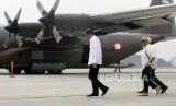 Presiden Joko Widodo (kiri) meninjau bantuan untuk Palestina didampingi Menlu Retno Marsudi (kanan) berlatar pesawat Hercules A130  di Pangkalan Udara TNI AU Halim Perdana Kusuma, Jakarta, Sabtu (4/11/2023). Presiden melepas bantuan tahap pertama yang akan diterbangkan dengan tiga pesawat berisi 51,5 ton bantuan berupa bahan makanan, alat medis, selimut, tenda dan barang-barang logistik lainnya yang telah disesuaikan dengan kebutuhan yang ada di Gaza.  (FOTO : EPA-EFE/BAGUS INDAHONO)