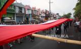 REPUBLIKA.CO.ID,  MOJOKERTO. --  Peserta membentangkan Bendera Merah Putih saat mengikuti gerak jalan Perjuangan Mojokerto-Suroboyo (Mojosuro) di Lapangan Raden Wijaya, Surodinawan, Kota Mojokerto, Jawa Timur, Sabtu (4/11/2023).