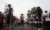 Peserta berjalan dengan enggrang saat mengikuti gerak jalan Perjuangan Mojokerto-Suroboyo (Mojosuro) di Lapangan Raden Wijaya, Surodinawan, Kota Mojokerto, Jawa Timur, Sabtu (4/11/2023). Gerak jalan perjuangan Mojokerto-Surabaya dengan menempuh jarak sekitar 56 kilometer itu merupakan napak tilas perjuangan pahlawan dalam rangka peringatan Hari Pahlawan. (FOTO : ANTARA FOTO/Syaiful Arif)