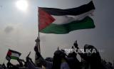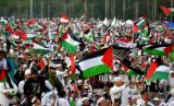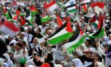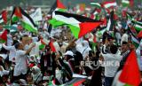 Peserta aksi membawa bendera sebagai bentuk dukungan terhadap perjuangan Palestina .