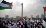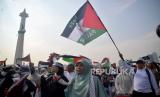 REPUBLIKA.CO.ID,JAKARTA -- Para peserta aksi mengibarkan bendera Palestina saat mengikuti Aksi Damai Aliansi Rakyat Indonesia Bela Palestina di Kawasan Monas, Jakarta, Ahad (5/11/2023).