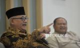 Ketua Umum DPP LDII KH Chriswanto Santoso (kiri) didampingi Sekretaris Umum DPP LDII Dody Taufik Wijaya memberikan keterangan terkait pelaksanaan Rakernas LDII 2023 di Jakarta, Ahad (5/11/2023). (FOTO : Republika/Prayogi)