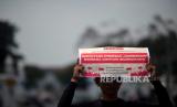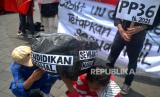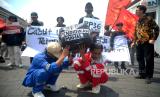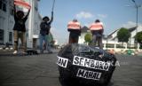 Mahasiswa yang tergabung dalam Front Perjuangan Pemuda Indonesia (FPI) menggelar aksi damai di Titik Nol Kilometer Yogyakarta, Senin (6/11/2023). Pada aksi damai ini mereka menuntut kenaikan upah minimun kabupaten (UMK) di Yogyakarta sesuai dengan kebutuhan hidup layak (KHL). UMK saat ini tertinggi di Yogyakarta sebesar Rp 2,3 juta dan KHLnya sebesar Rp 4,1 juta. Selain itu, mereka juga menuntut Pemerintah mencabut UU Cipta Kerja. (FOTO : Republika/Wihdan Hidayat)