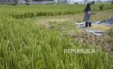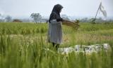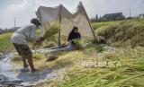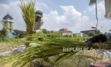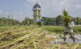 Petani megayak padi di lahan persawahan di Soreang, Kabupaten Bandung, Jawa Barat, Senin (6/11/2023). Berdasarkan keterangan petani, saat ini harga gabah kering di tingkat petani naik hingga Rp750 ribu per kuintal. Nilai harga tersebut mengalami perubahan dari harga sebelumnya yang hanya Rp500 ribu. Kenaikan tersebut diakibatkan oleh pasokan panen padi yang berkurang karena faktor musim kemarau. (FOTO : ABDAN SYAKURA/REPUBLIKA)
