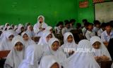 Santri menyimak materi dari Redaktur Foto Republika Yogi Ardhi pada acara Republika Sapa Santri di Pesantren Husainiyah, Kecamatan Cicalengka, Kabupaten Bandung, Jawa Barat, Senin (6/11/2023). Republika bersama Yayasan Pesantren Husainiyah menggelar kegiatan pelatihan smartphone fotografi yang diikuti oleh sebanyak 130 santri guna melatih keterampilan para santri dalam bidang fotografi dan jurnalistik. (FOTO : Republika/Thoudy Badai)