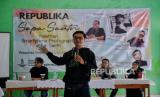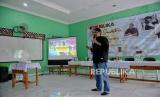 Redaktur Foto Republika Yogi Ardhi memaparkan materi pada acara Republika Sapa Santri di Pesantren Husainiyah, Kecamatan Cicalengka, Kabupaten Bandung, Jawa Barat, Senin (6/11/2023). Republika bersama Yayasan Pesantren Husainiyah menggelar kegiatan pelatihan smartphone fotografi yang diikuti oleh sebanyak 130 santri guna melatih keterampilan para santri dalam bidang fotografi dan jurnalistik. (FOTO : Republika/Thoudy Badai)
