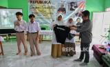 Asisten Redaktur Pelaksana Republika Edwin Dwi Putranto (kanan) menyerahkan cinderamata kepada santri pada acara Republika Sapa Santri di Pesantren Husainiyah, Kecamatan Cicalengka, Kabupaten Bandung, Jawa Barat, Senin (6/11/2023). Republika bersama Yayasan Pesantren Husainiyah menggelar kegiatan pelatihan smartphone fotografi yang diikuti oleh sebanyak 130 santri guna melatih keterampilan para santri dalam bidang fotografi dan jurnalistik. (FOTO : Republika/Thoudy Badai)