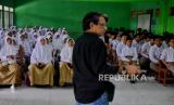 Redaktur Foto Republika Tahta Aidilla memaparkan materi pada acara Republika Sapa Santri di Pesantren Husainiyah, Kecamatan Cicalengka, Kabupaten Bandung, Jawa Barat, Senin (6/11/2023). Republika bersama Yayasan Pesantren Husainiyah menggelar kegiatan pelatihan smartphone fotografi yang diikuti oleh sebanyak 130 santri guna melatih keterampilan para santri dalam bidang fotografi dan jurnalistik. (FOTO : Republika/Thoudy Badai)